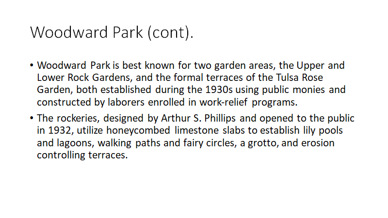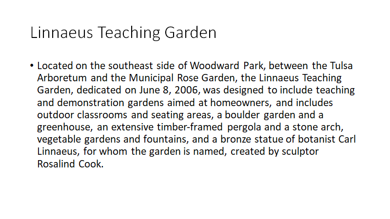 This is the program that I presented to the Dallas Council of Garden Clubs on Friday April 8th, 2022. Due to technical difficulties, I was unable to show the photos that were part of the program. I have created a series of slideshows showing a few of the public gardens in Tulsa, Oklahoma. These photos were taken last June.